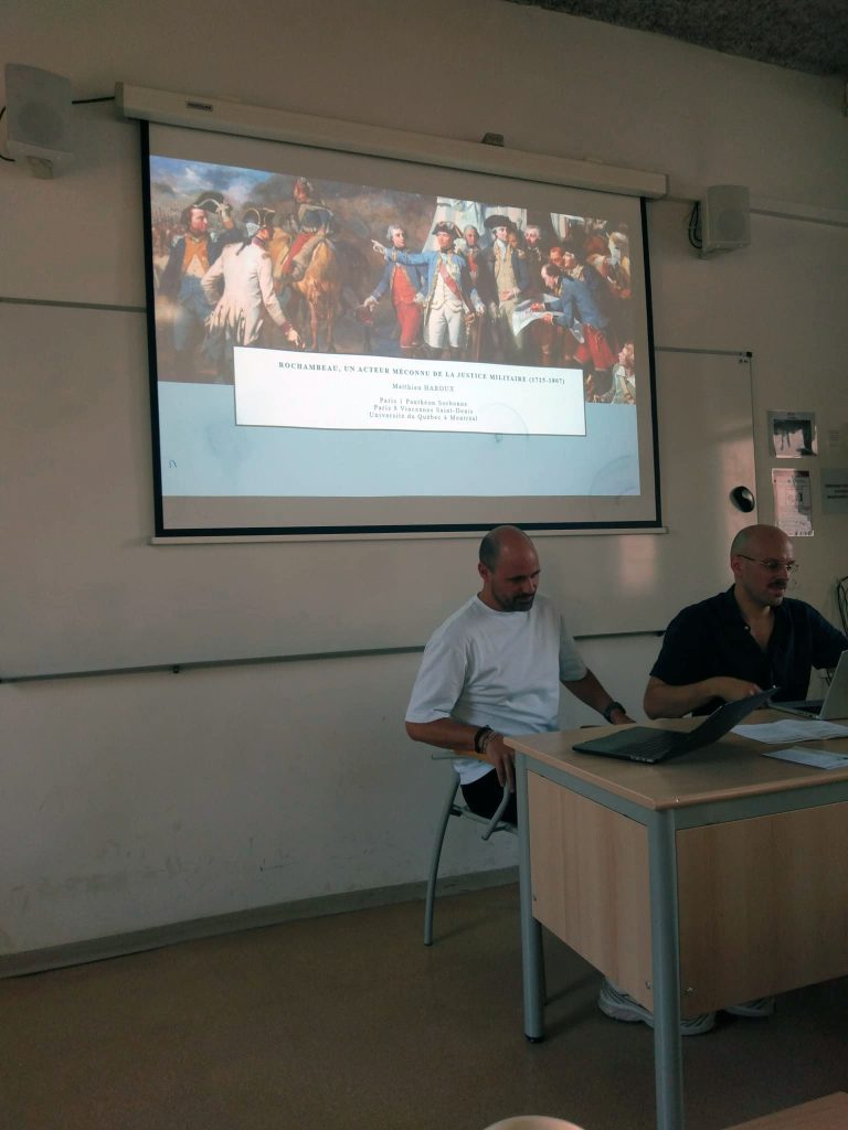 L’équipe Justice militaire y a proposé un panel, La construction des systèmes de justice militaire, de l’expansion européenne aux guerres de décolonisation (XIVe-XXe siècle), dirigé par Benjamin Deruelle, professeur d’histoire moderne à l’UQÀM, directeur du GRHG et Guillaume Pinet, professeur associé d’histoire moderne à l’UQÀM, postdoctorant au GRHG: